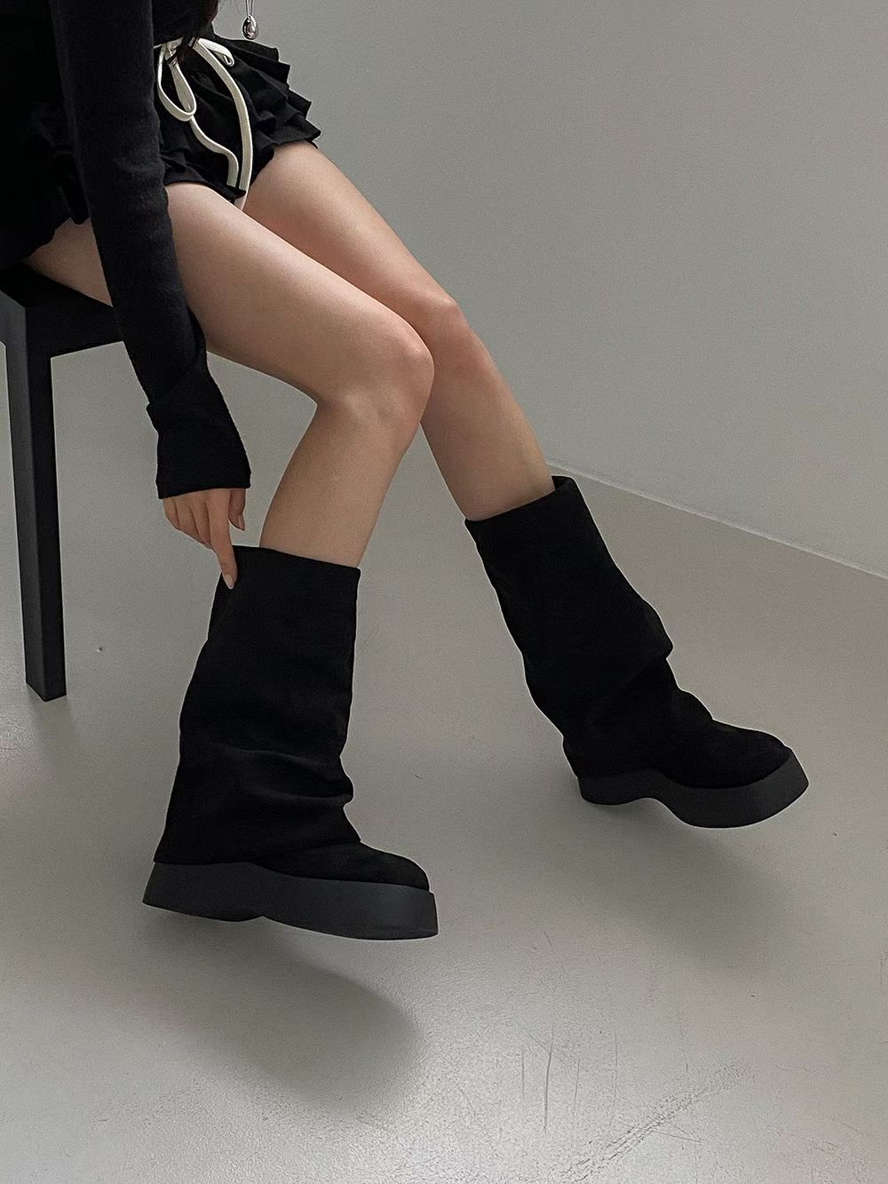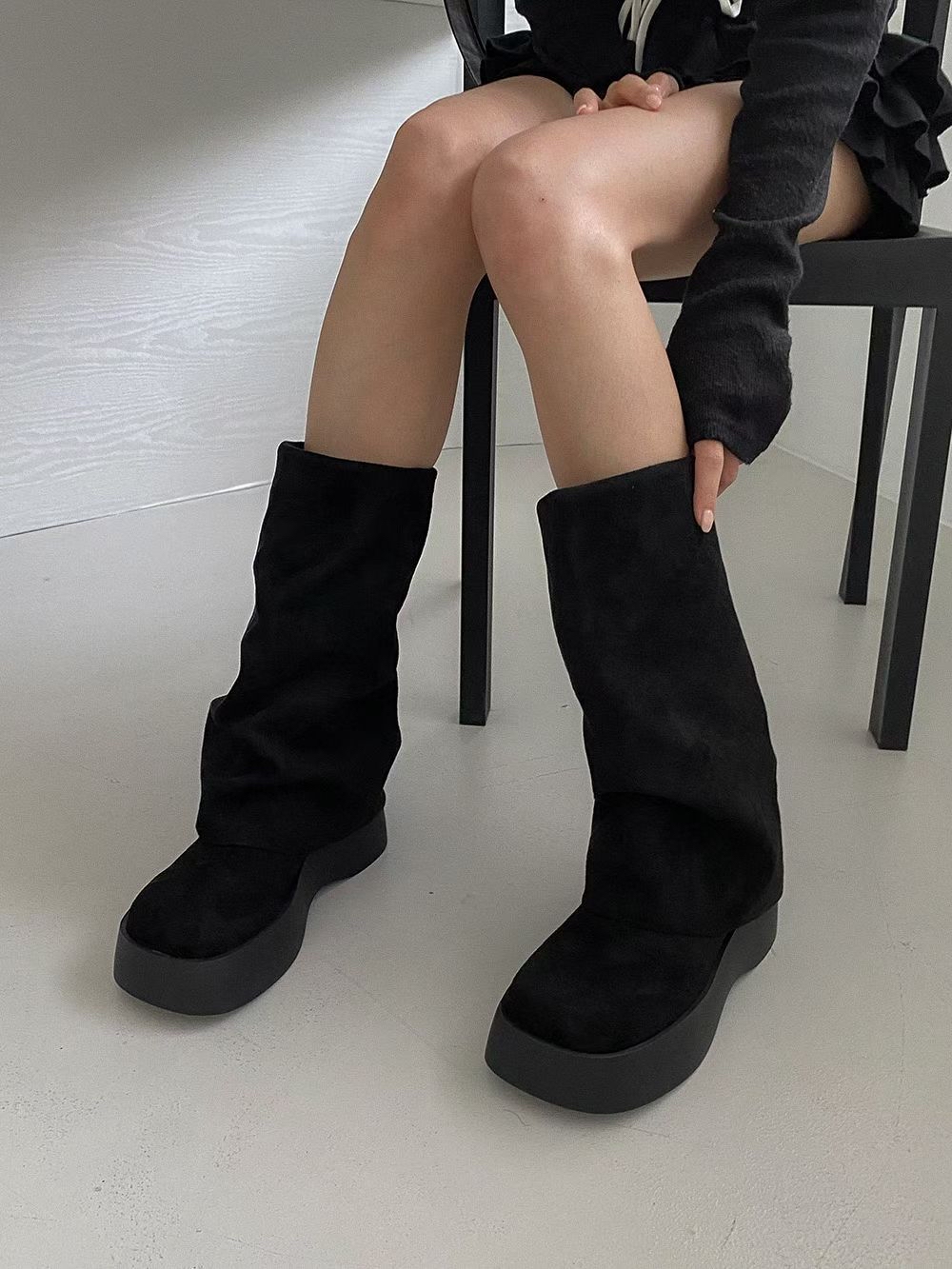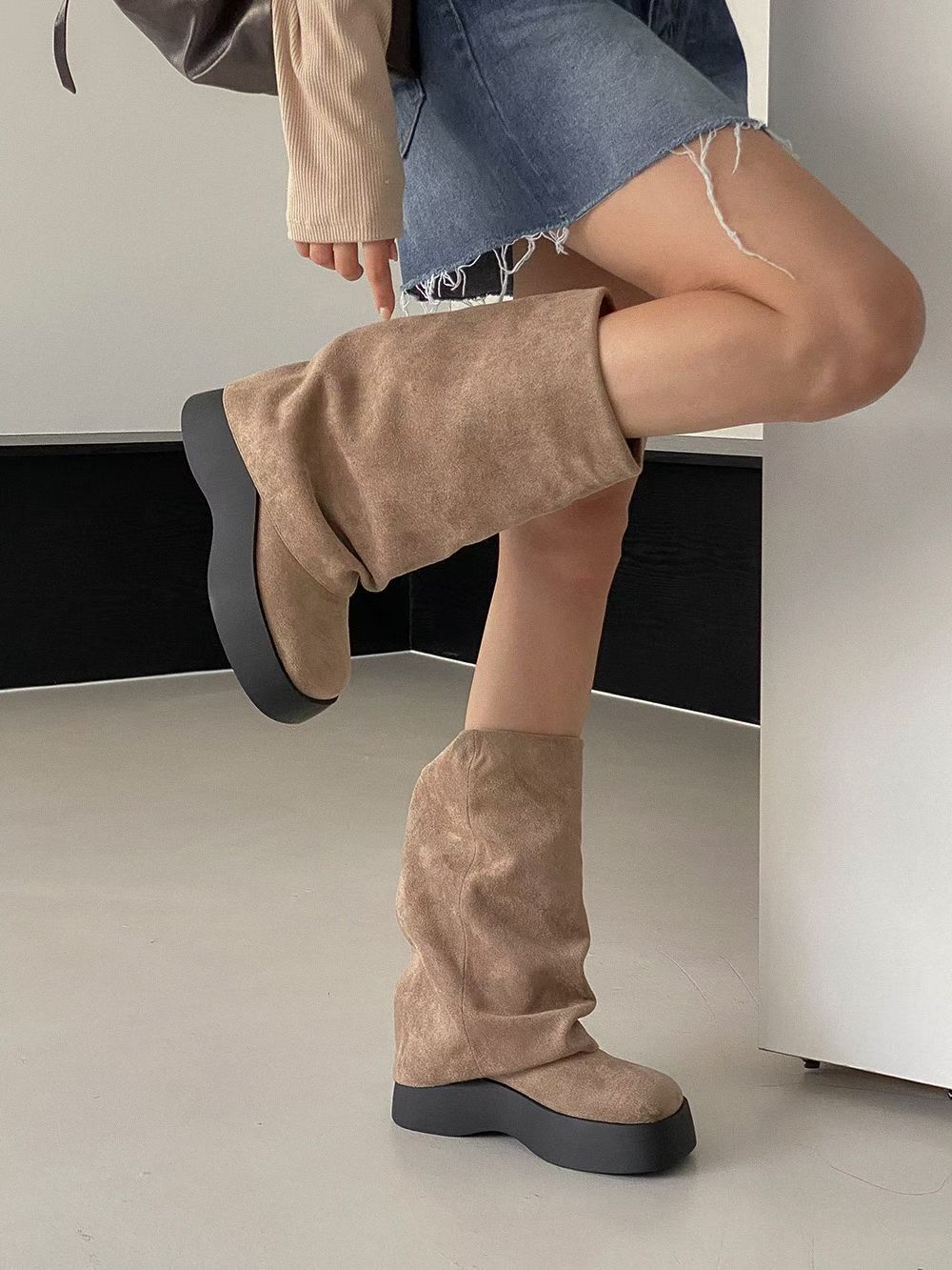 麂皮設計🤍 好可愛嘅設計同長度!! 而且可以勁顯瘦遮小腿🤍 尺寸235 - 225~250 (5cm) 腳寬 - 7.5 cm 鞋跟高 - 6 cm 材質 - 絨面革 香港碼數會係35-40(225-250) 呢款購買正碼就可以啦!!