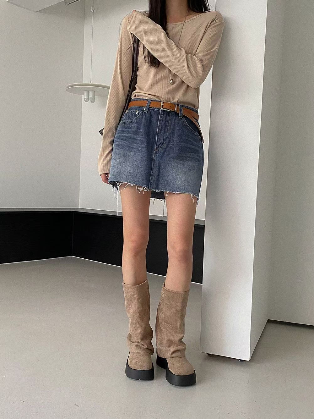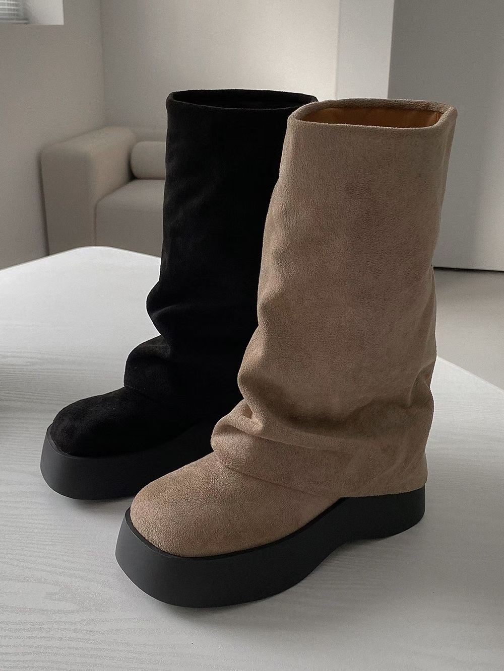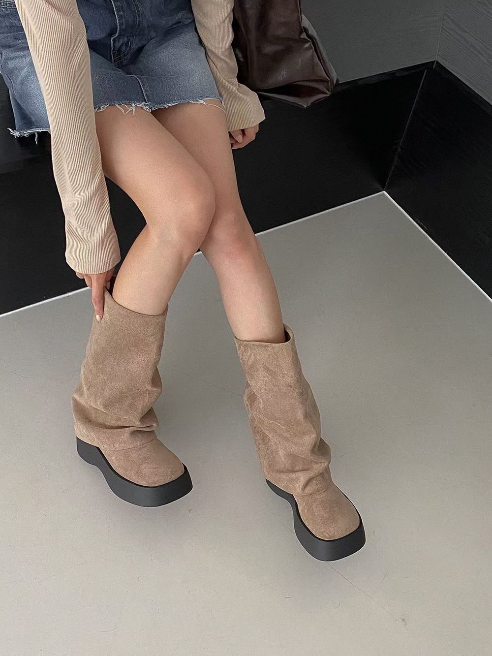 麂皮設計🤍 好可愛嘅設計同長度!! 而且可以勁顯瘦遮小腿🤍 尺寸235 - 225~250 (5cm) 腳寬 - 7.5 cm 鞋跟高 - 6 cm 材質 - 絨面革 香港碼數會係35-40(225-250) 呢款購買正碼就可以啦!!